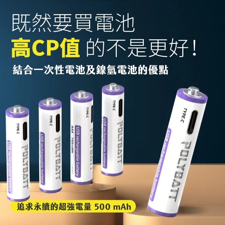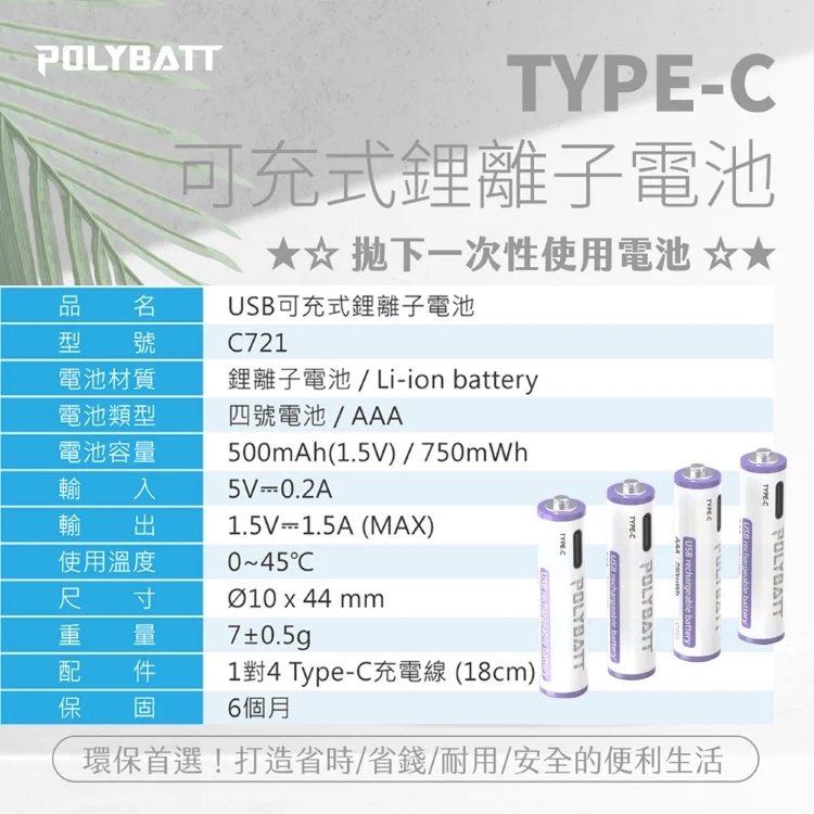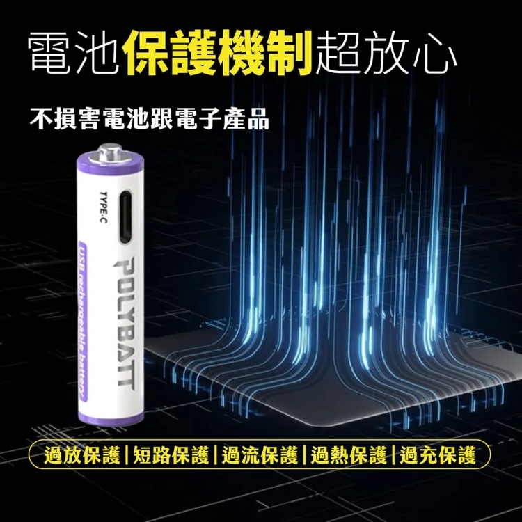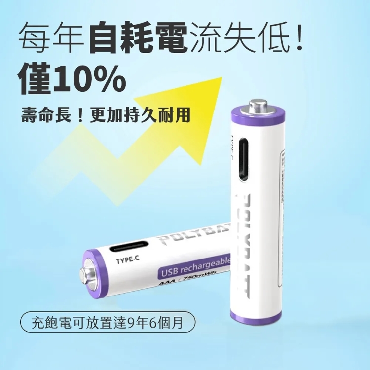 POLYBATT 4號AAA USB充電式電池 750mWh 充電鋰電池4入裝(附一對四充電線) C721