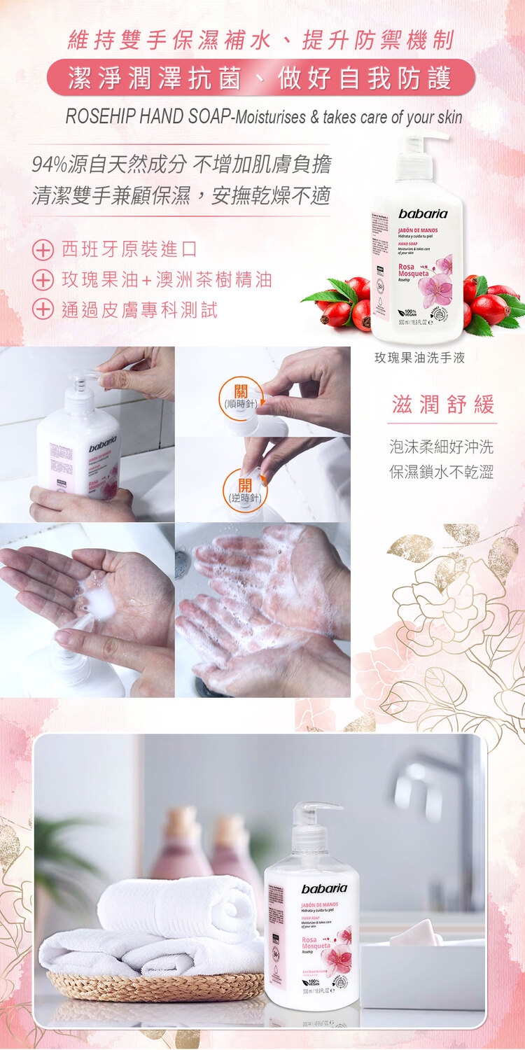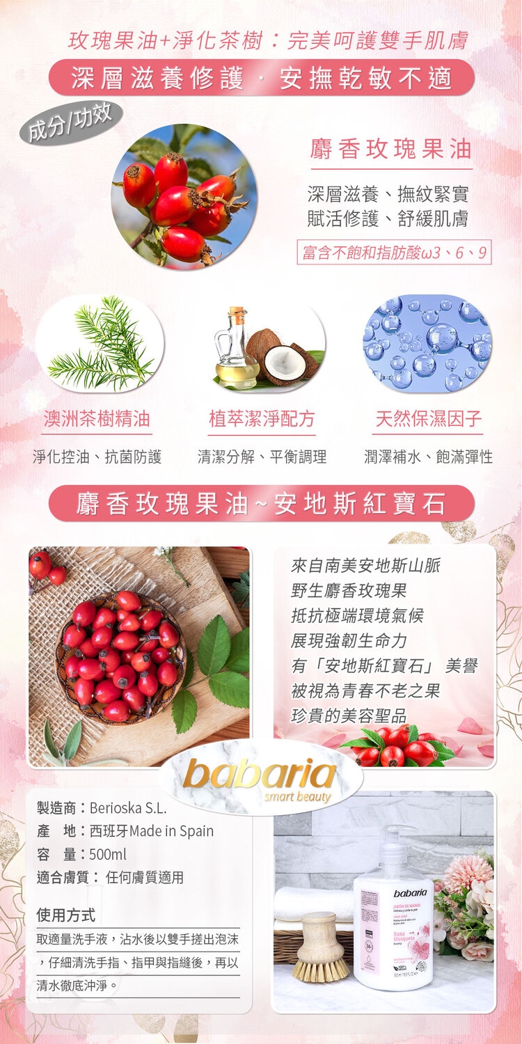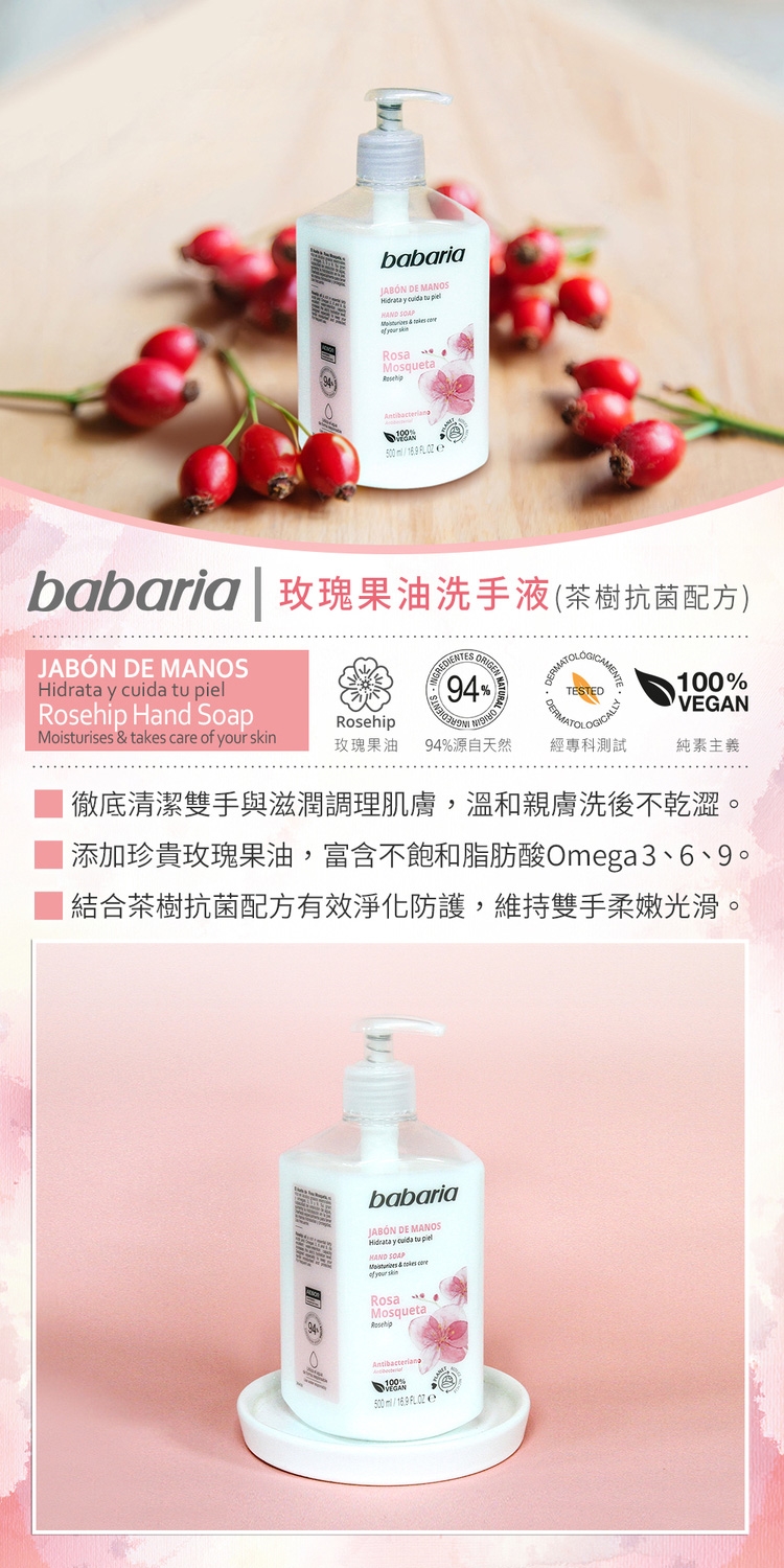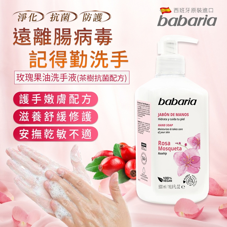 babaria 洗手液 500ml 任選4入-玫瑰果油/蘆薈 (茶樹抗菌配方)
