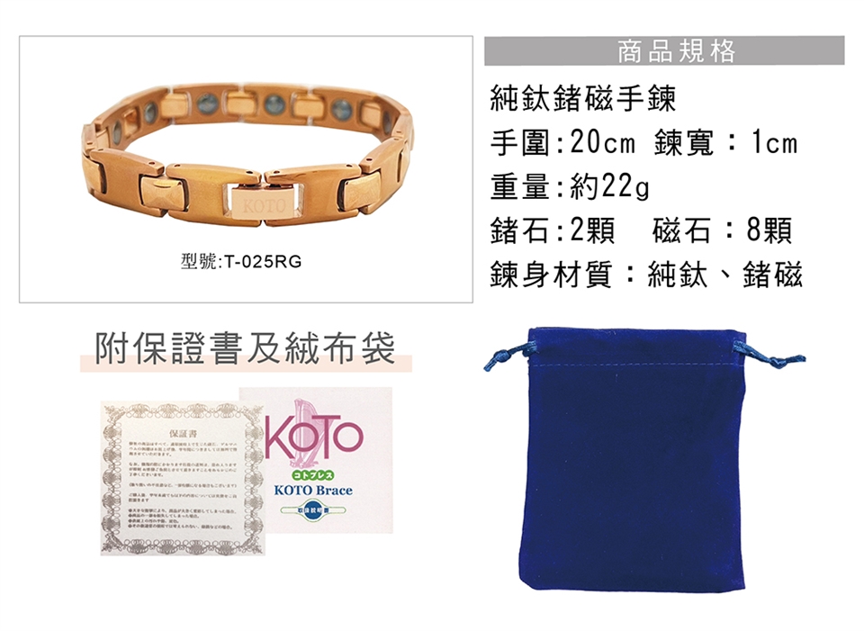 品名:KOTO原廠外銷 T-025RG 鍺磁健康鈦手鍊 玫瑰金限量款1入(高級絨布袋精裝)