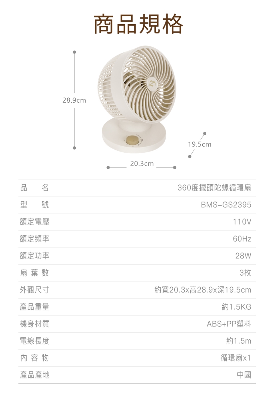 【巴慕斯 BAMOUSSE】360度擺頭陀螺循環扇 BMS-GS2395