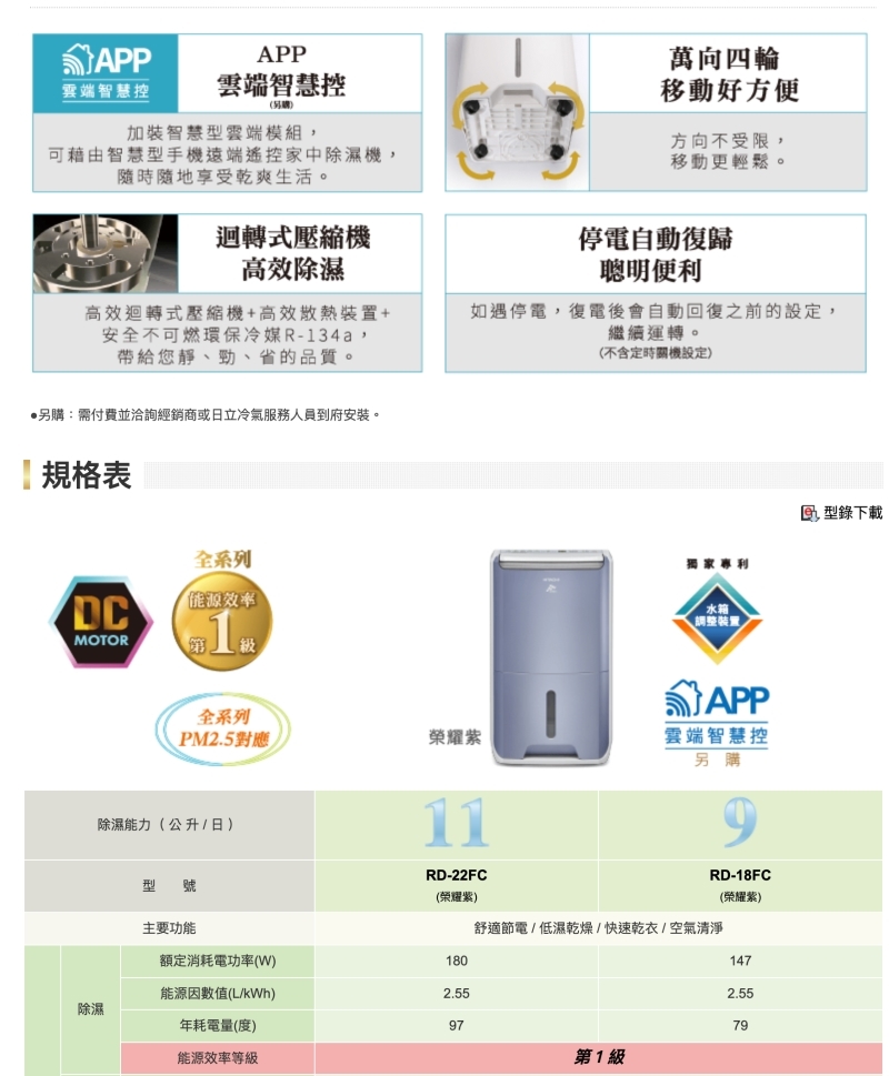 【商品名稱】【HITACHI 日立】一級能效 11公升 清淨型除濕機 RD-22FC 榮耀紫