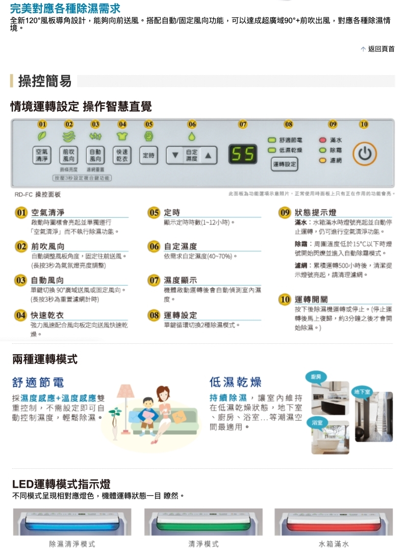 .LED運轉模式指示燈:藍(除濕清淨) / 紅(滿水) / 綠(清淨)