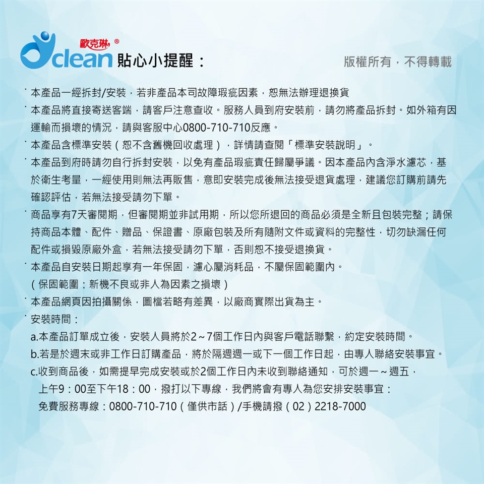 商品到貨享十天猶豫期之權益(注意!猶豫期非試用期),辦理退貨商品必須是全新狀態且包裝完整,否則將會影響退貨權限。各類商品退換貨限制說明。淨水器商品若已拆封 (如剪標、下水等情形…),視為已使用,恕本公司無法接受退換貨。否則須負擔所有濾心耗損費用共4500元整。