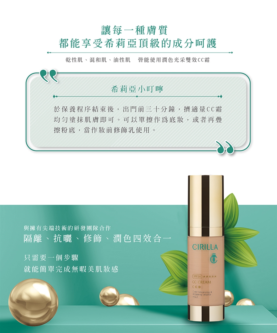 商品名稱:CIRILLA潤色光采雙效CC霜SPF30 ★★★★★