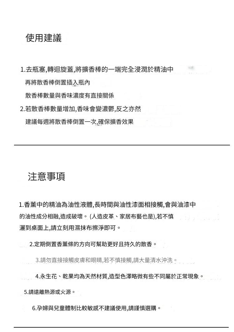 擴香瓶擺著就會散發香氣,但其實可以控制香氣的濃度唷! 重點就在於「擴香枝」的運用,想讓香味濃度「強」,建議每天倒轉擴香枝;「中度」的話建議每3天倒轉擴香枝,想讓香味低調,不太明顯的話,只要每週倒轉擴香枝一次,空間就會維持淡淡的香氣。
