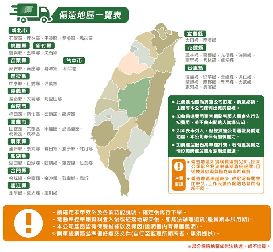 ◆注意:◆本產品除本身瑕疵故障外,經落地騎乘後屬無法復原為全新品之商品 ◆請勿擅自拆卸車體,避免為您的車輛帶來未知的危險狀況。 ◆清潔車輛時請勿用水直接清洗及高壓水槍沖洗,以防電器件受潮短路。 ◆在天氣狀況較不穩定時,如雨天、起霧天氣騎行應保持安全車距。 保固內容: 以本車所提供之品質保證書內容條款詳述,鋰電池保固兩年(只限本賣場),車架、電機馬達、電子控制器、充電器、保固一年, 各項開關按鈕、轉把、喇叭、DC轉換器保固三個月,外殼塑件、燈泡、車胎、剎車皮屬消耗品無提供保固。 保固適用地區:台灣本島所使用之本公司電動自行車。 行進間注意事項: 1.嚴禁兩人乘座!依據慢車道路交通法規規定,除旗乘外,禁止於任何情況下搭載其他人員。 2.在能見度差時,需輔以照明騎乘,請開啟大燈照明以維持行車安全。 3.積雪、結冰、泥濘、高低不平之路面或濕滑的鐵板上,容易造成車輛滑倒,請下車推行。 4.請勿不當行駛,並遵守行車禮儀與安全、勿在馬路上進行不當之騎乘行為,如車輛蛇行、單輪騎乘、跳躍…等不適宜之行為。 5.飲酒後及身體不適時不要騎乘,以免身體運動能力與反應機能下降、危害行車安全。 6.不可單手騎乘。除必要交通示意手勢外、請雙手緊握車把騎乘,下雨天時、也請穿著雨衣騎乘,勿以單手騎乘車輛。 7.注意物品運載安全。 8.騎乘時,請勿穿著防礙駕駛安全服裝,以免衣物並入車輛輪圈、齒輪等轉動處,造成傷害之危險。 9.肢體及物品不可接近車輛回轉部位。嚴禁人員將肢體或任何物品伸入車輪輪圈、鏈條、齒輪…等轉動處,以避免有可能造成傷害之危險。 10.車輛涉水深度。本車為電動產品,大雨時或涉水深度超過10cm,請避免使用或繞道,以避免馬達或電路系統浸水而導致損壞。 11.不騎乘或牽動車輛時,為維護安全請關閉電源以防不慎驅動馬達,造成車輛爆衝。 12.電池沒電時應盡速對電池進行充電,防止造成過放(人為因素造成過放恕不保固).長時間不騎乘時應將電池充飽電放置通風處.