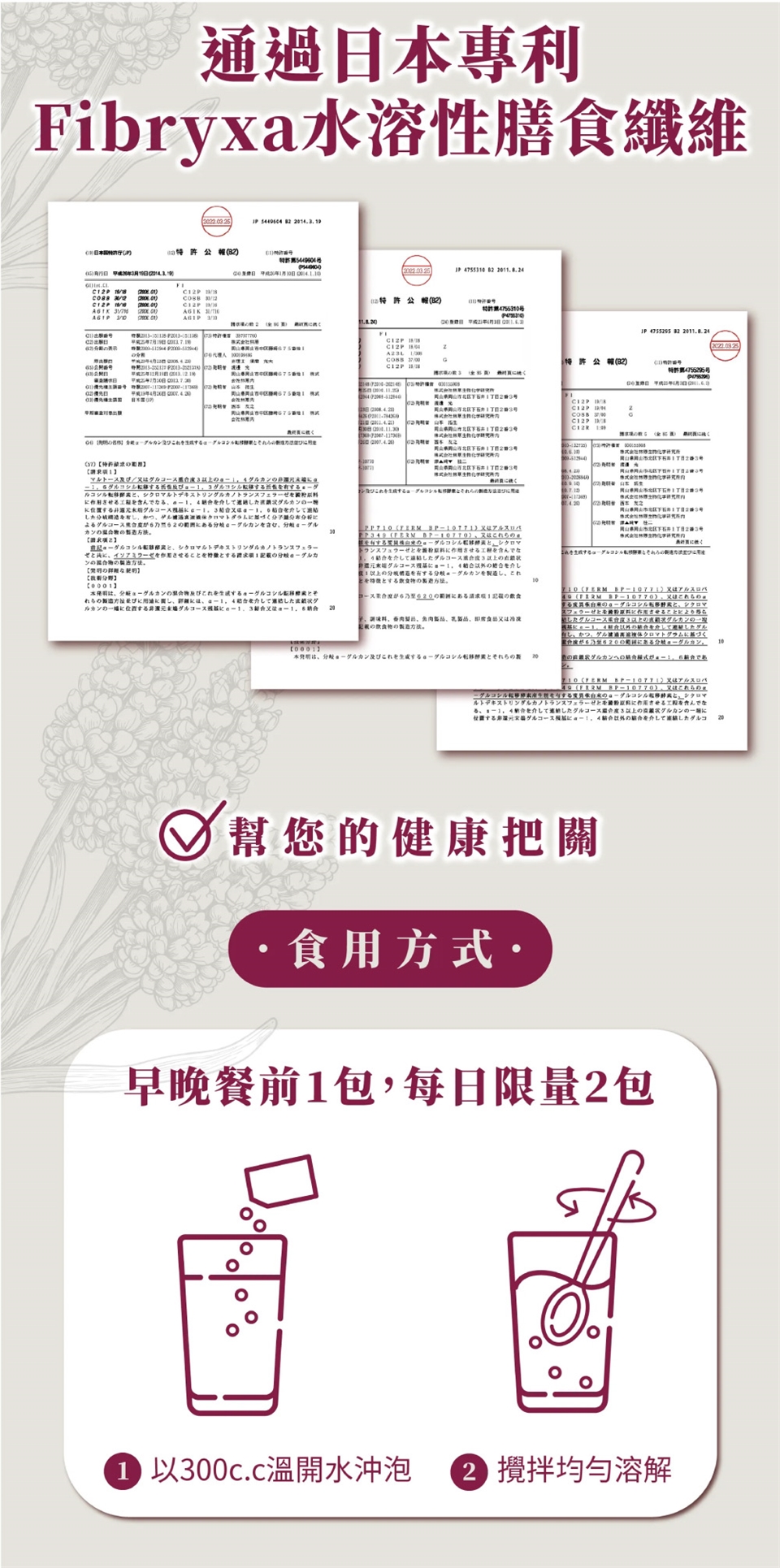 早晚餐前1包,搭配300c.c溫開水,攪拌均勻溶解後再食用。每日限量2包。