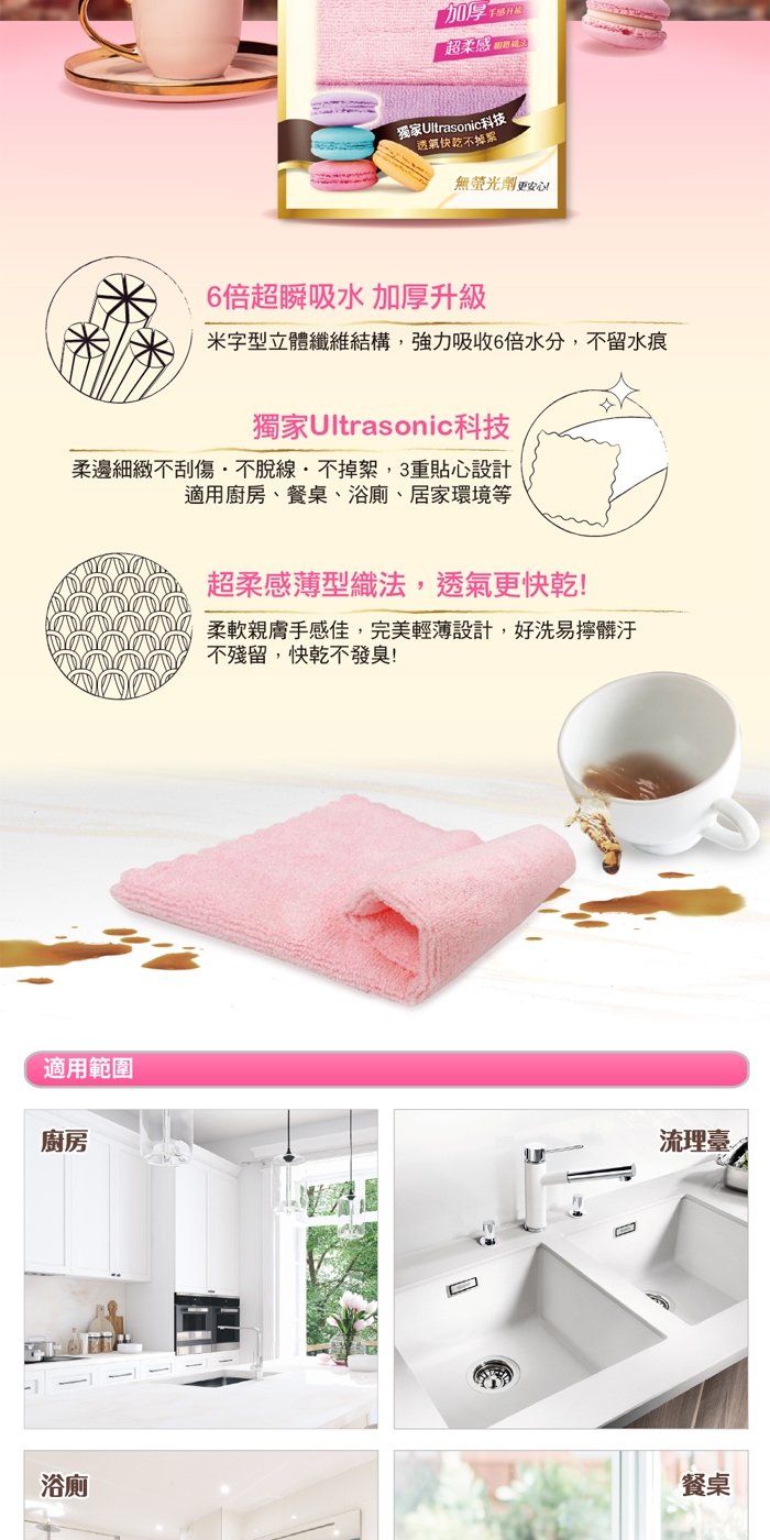 ◆ 獨家Ultrasonic科技:柔邊細緻不刮傷、不脫線、不掉絮,3重貼心設計,適用廚房、餐桌、浴廁、居家環境等。