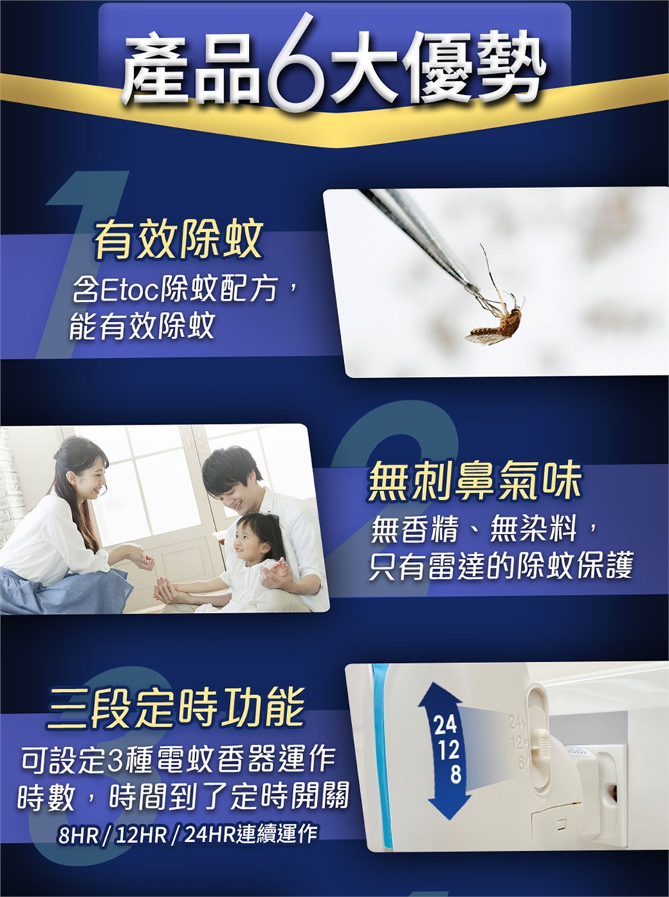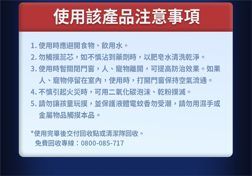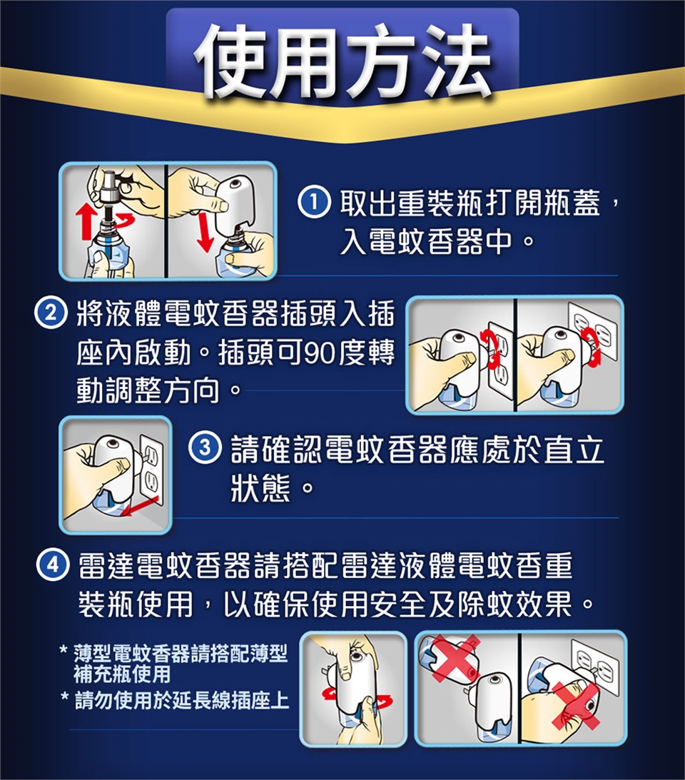 4. 雷達電蚊香器請搭配雷達液體電蚊香重裝瓶使用,以確保使用安全及除蚊效果。(薄型電蚊香器請搭配薄型補充瓶使用)