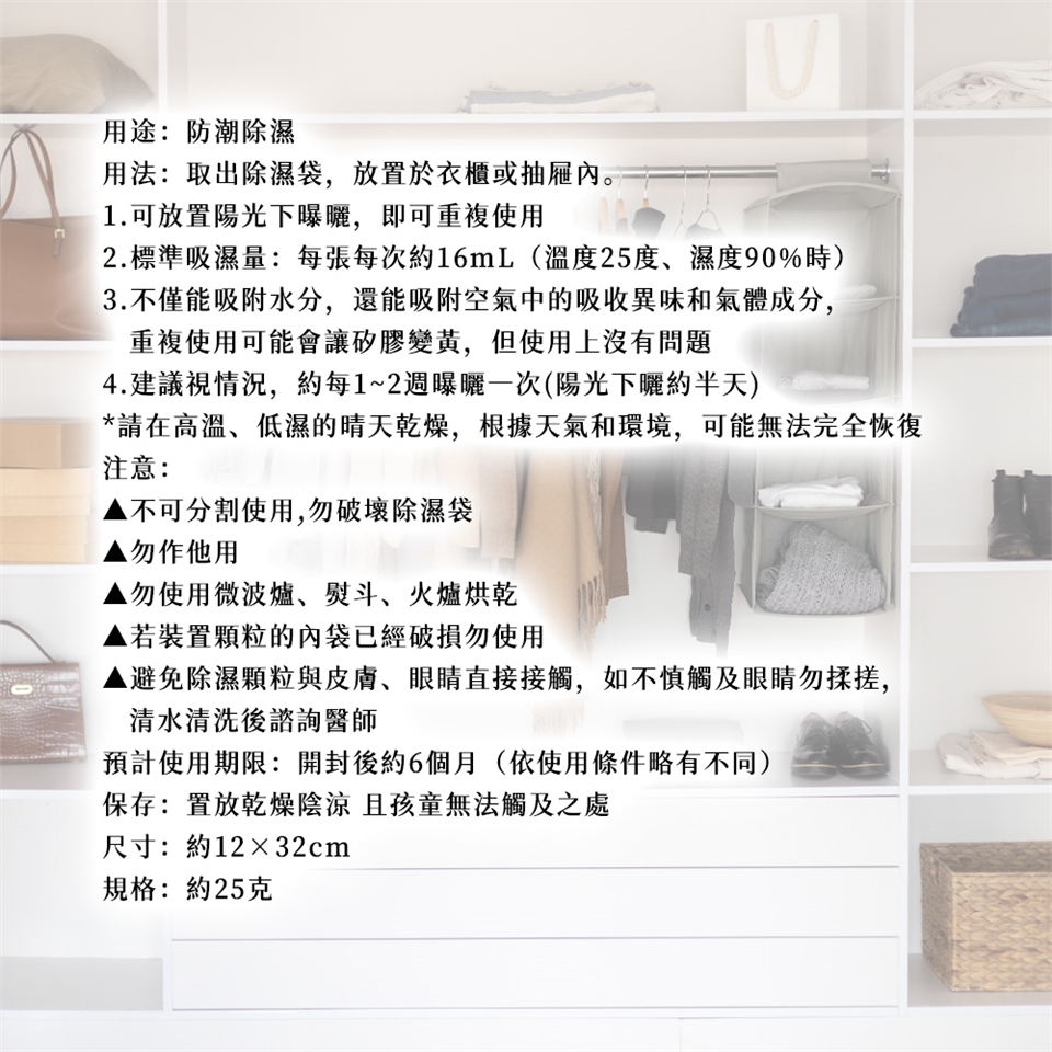 ✔吸濕防臭必備,有效去除衣櫃中的濕氣、異味,防止衣物霉味