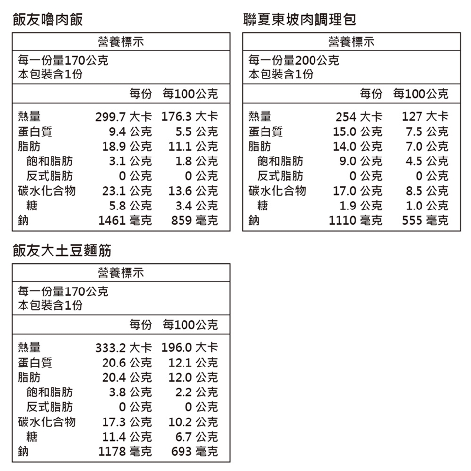 聯夏東坡肉調理包-水、豬肉(原產地:台灣)、白蘿蔔、紅蘿蔔、醬油、乙醯化己二酸二澱粉、砂糖、甜麵醬[黃豆(非基因改造)、白米、水、鹽、高果糖糖漿、焦糖色素(著色劑)、味噌種麴]、食鹽、風味調味料(食鹽、砂糖、柴魚粉、L-麩酸鈉、5'-次黃嘌呤核苷磷酸二鈉、5'-鳥嘌呤核苷磷酸二鈉、琥珀酸二鈉)、米酒、焦糖色素、白胡椒粉、八角粉、山奈粉、甘草粉、薑粉、小茴香粉、胺基乙酸、5'-次黃嘌呤核苷磷酸二鈉、5'-鳥嘌呤核苷磷酸二鈉、琥珀酸二鈉、水解大豆蛋白調味粉[胺基酸(大豆水解蛋白)、鹽]◦