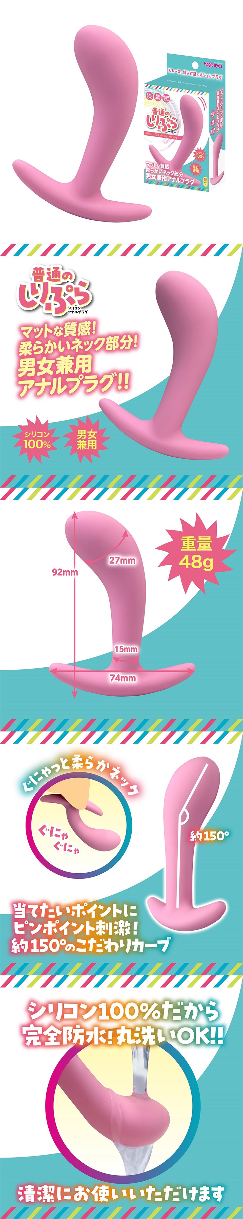矽膠後庭塞「しりぷら」是一款男女皆宜的塞子,由全矽膠材料製成,適合初學者到中級用戶前後使用。小しりぷら的總長度為77毫米,最大直徑為23毫米,適合初學者。一旦習慣了,您可以嘗試總長度為 92 毫米、最大直徑為 28 毫米的常規しりぷら,以及總長度為 125 毫米、最大直徑為 37 毫米的較大しりぷら。 150度曲線憑藉矽膠的彈性可以輕鬆使用。