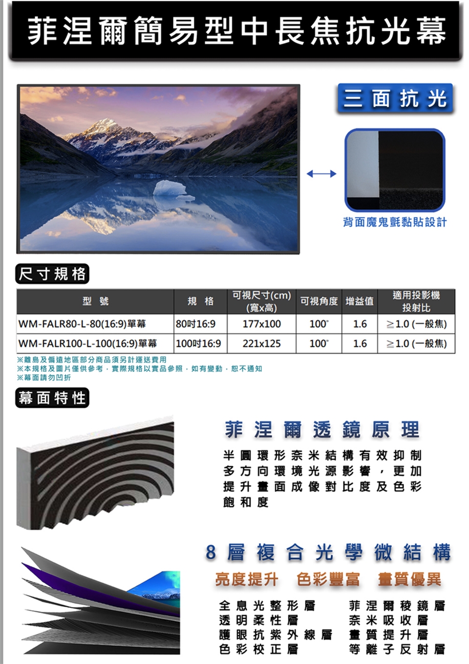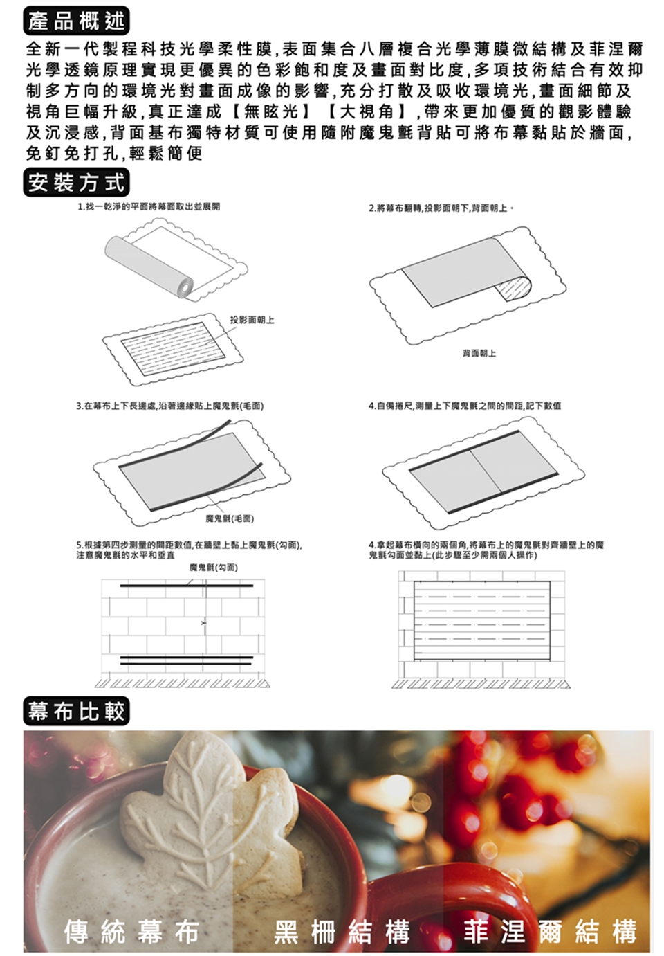 1. 幕面有非常細微之結構,容易刮傷,請務必小心硬物摩擦