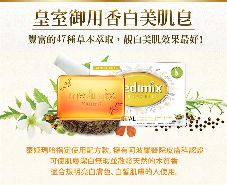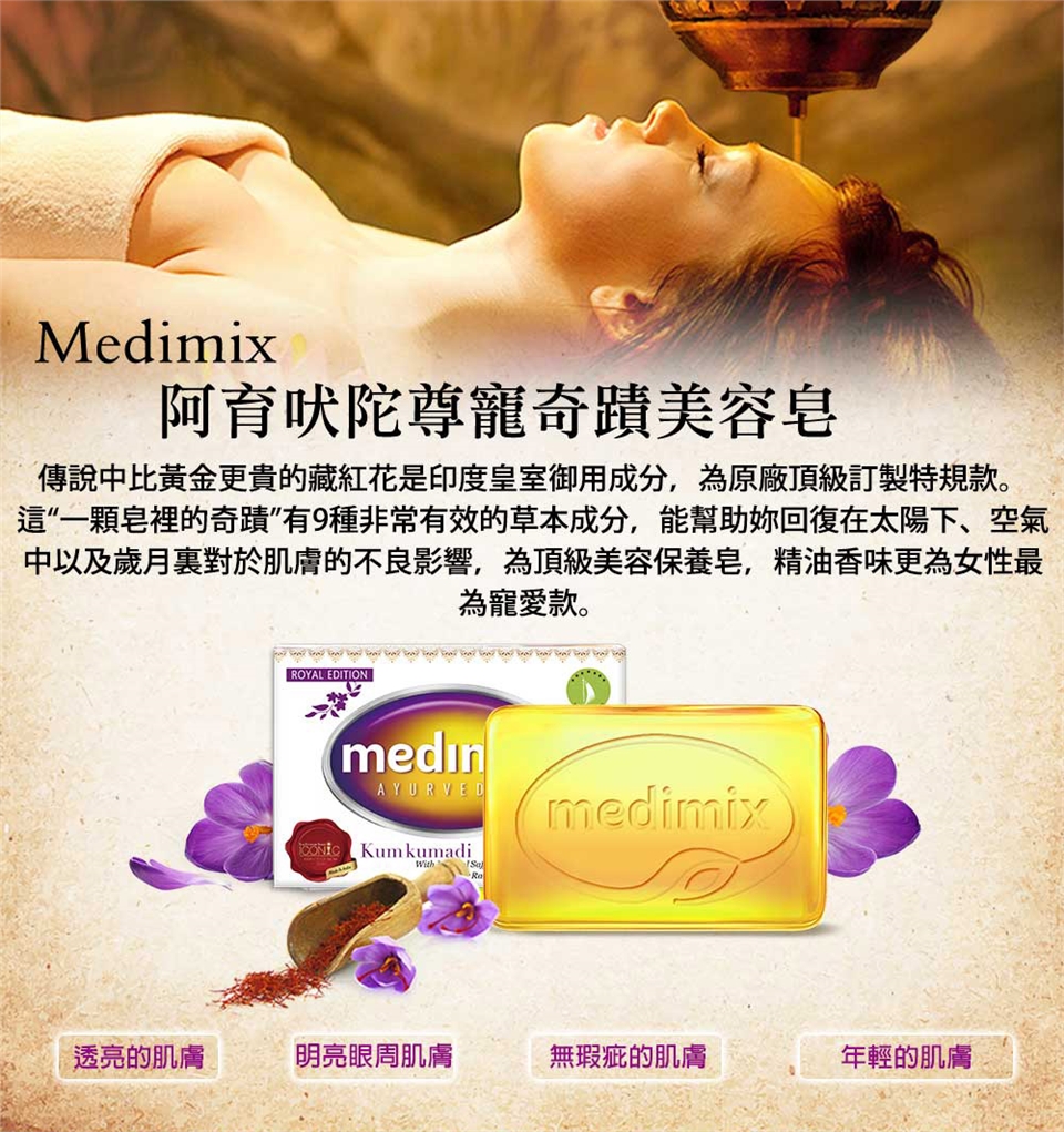 2.美姬Medimix阿育吠陀草本手工皂 :每日1~2次,將本品均勻塗抹於欲清潔之肌膚,搓揉起泡並輕柔按摩,在皮膚上停留3-5分鐘,再以清水洗淨即可,建議洗澡、洗臉及洗頭均可適用。