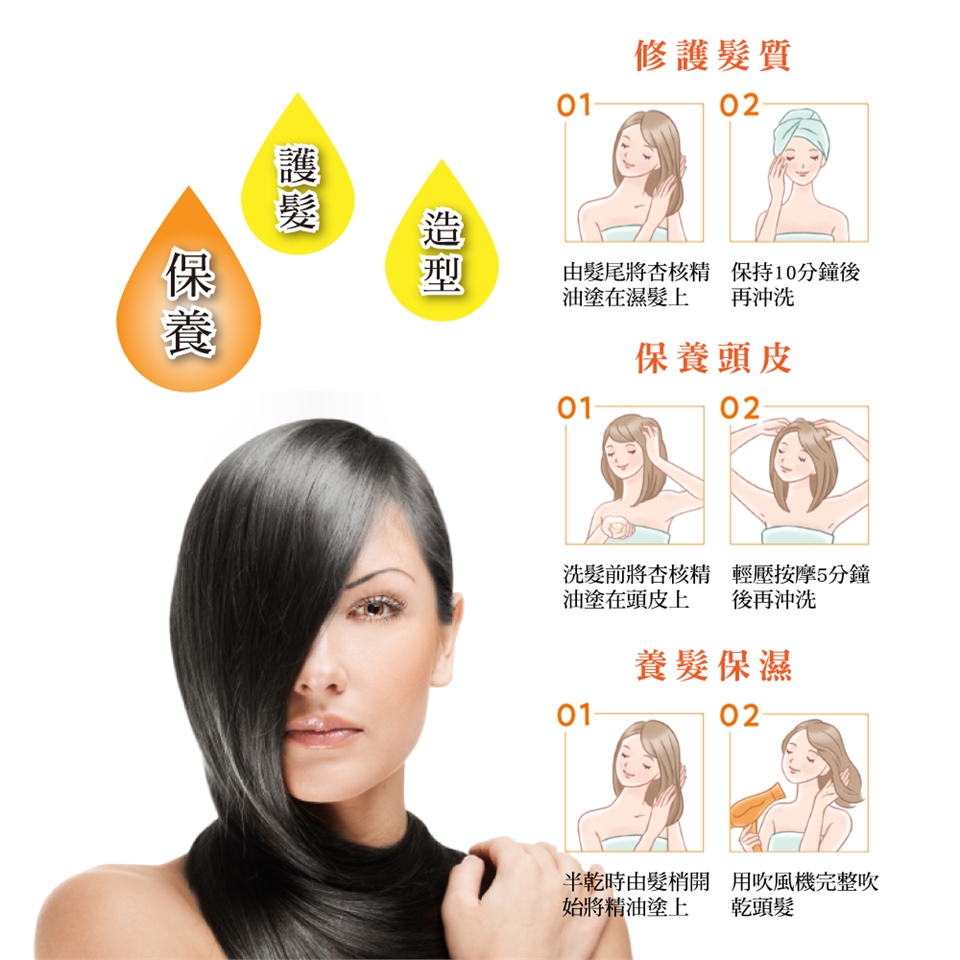 絕對不能髮絲必要的水分跟油脂流失,才能夠擁有亮澤滑順的秀髮!天然杏核是高滋潤不乾性果油,