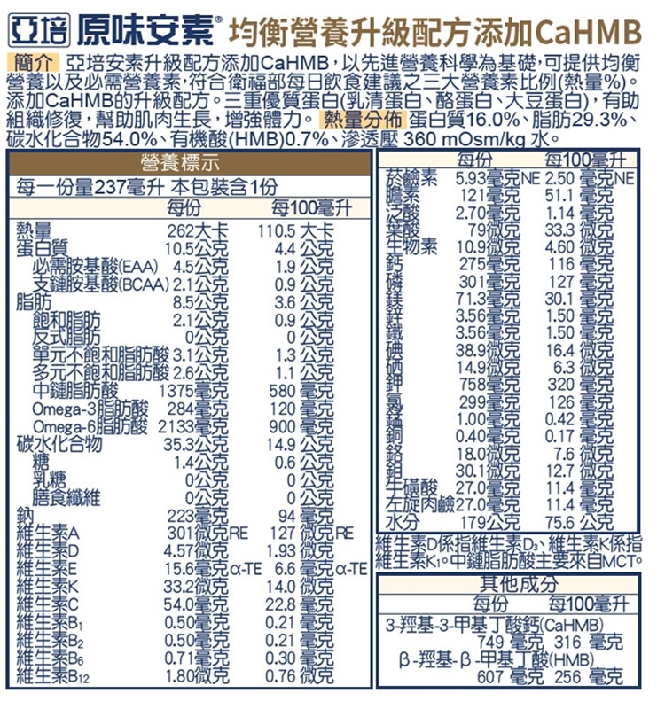 ◆ 亞培安素升級配方添加CaHMB,以先進營養科學為基礎,可提供均衡營養以及必需營養素,符合衛福部每日飲食建議之三大營養素比例(熱量%)。