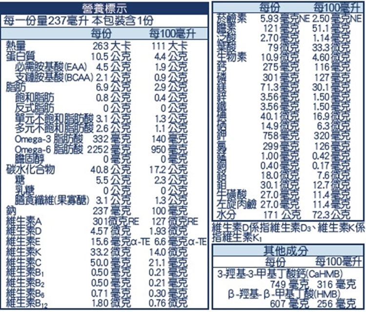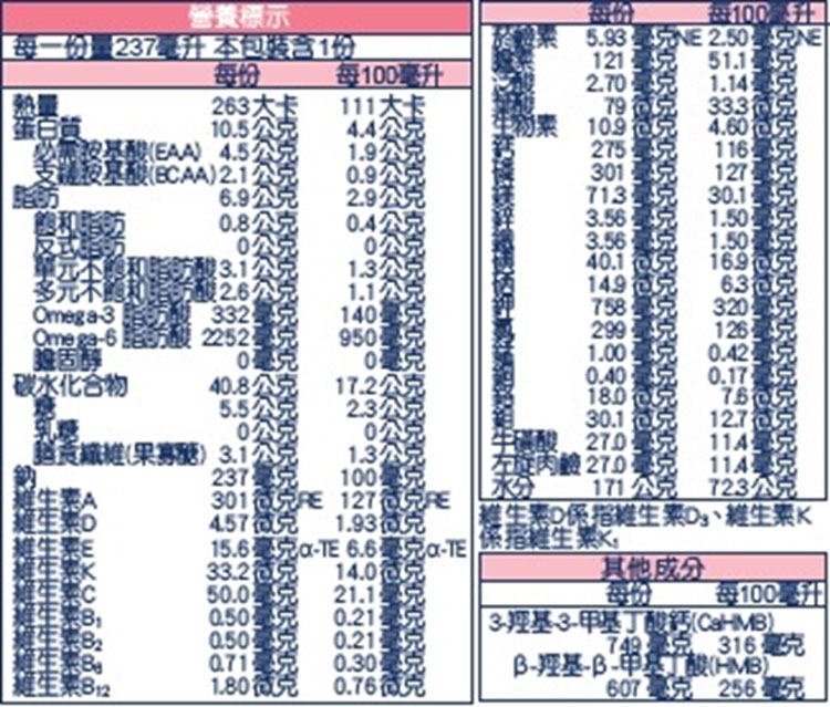 | 其他揭露事項 | 本品屬特定疾病配方食品,不適合一般人食用,須經醫師或營養師指導使用,作為唯一營養來源時,每日飲用1500大卡,可取代正餐,或作為二餐間使用之部分營養補充之口飲或管灌食品。非經專業人員指導,不建議給孩童,不適宜孕婦及未滿18歲者食用。半乳糖血症者不適用。請勿由靜脈注射。食用過量無助於疾病改善。本產品含有牛奶、大豆及其製品。本產品零乳糖。營養宣稱以100毫升為衡量基準。 保存條件 未開罐前可存放在乾燥陰涼處,開罐後請儘速使用,開罐後未馬上使用的部分請加蓋冷藏,並在24小時內用完。 *減甜(糖)係與亞培安素液體營養品香草口味相比,糖含量降低58% |