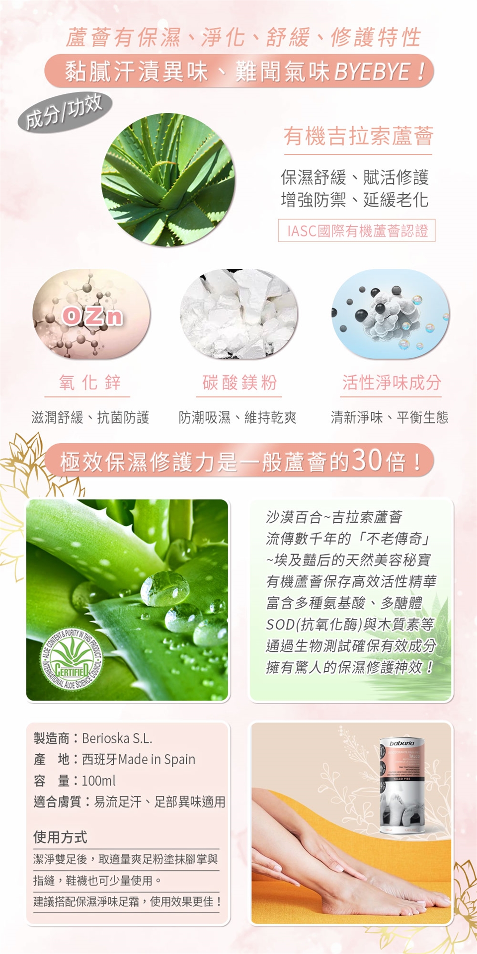 █ 蘆薈等活性成分能有效滋潤護理雙足,防止腳汗和異味。