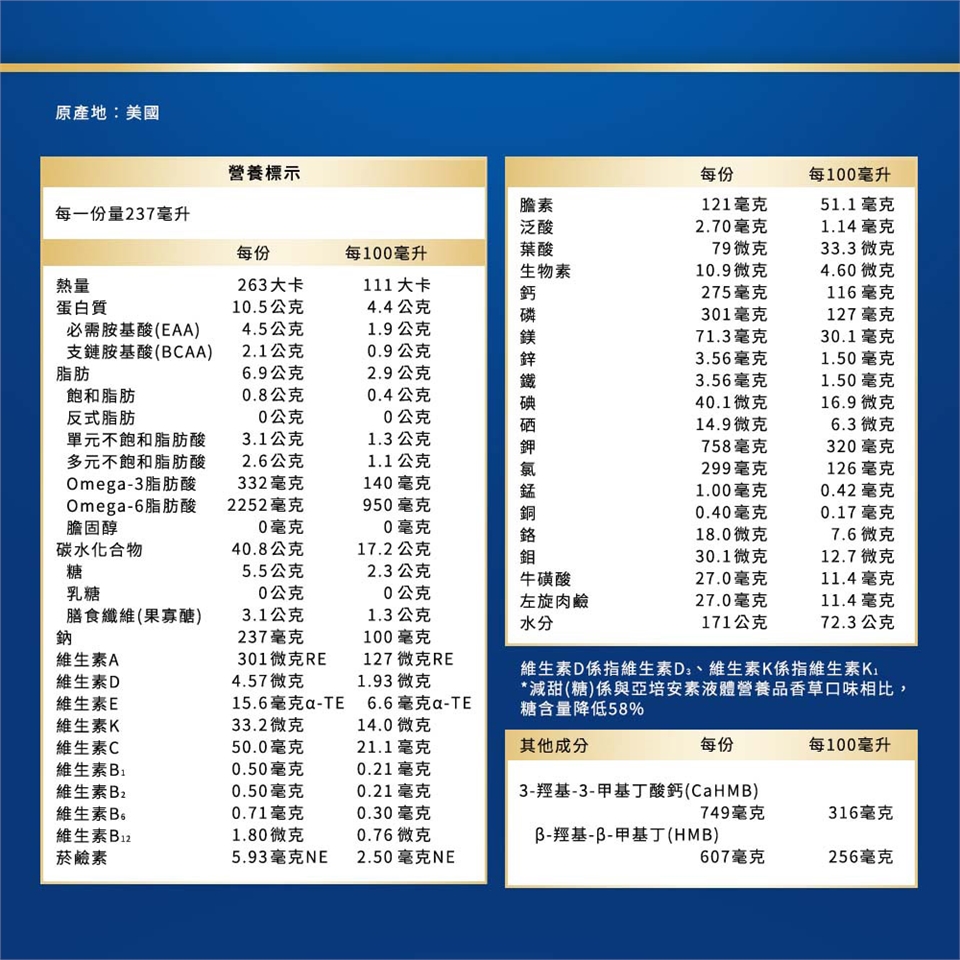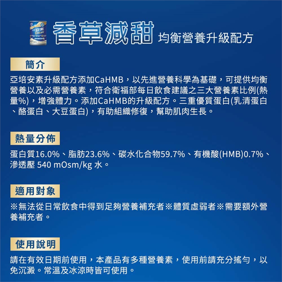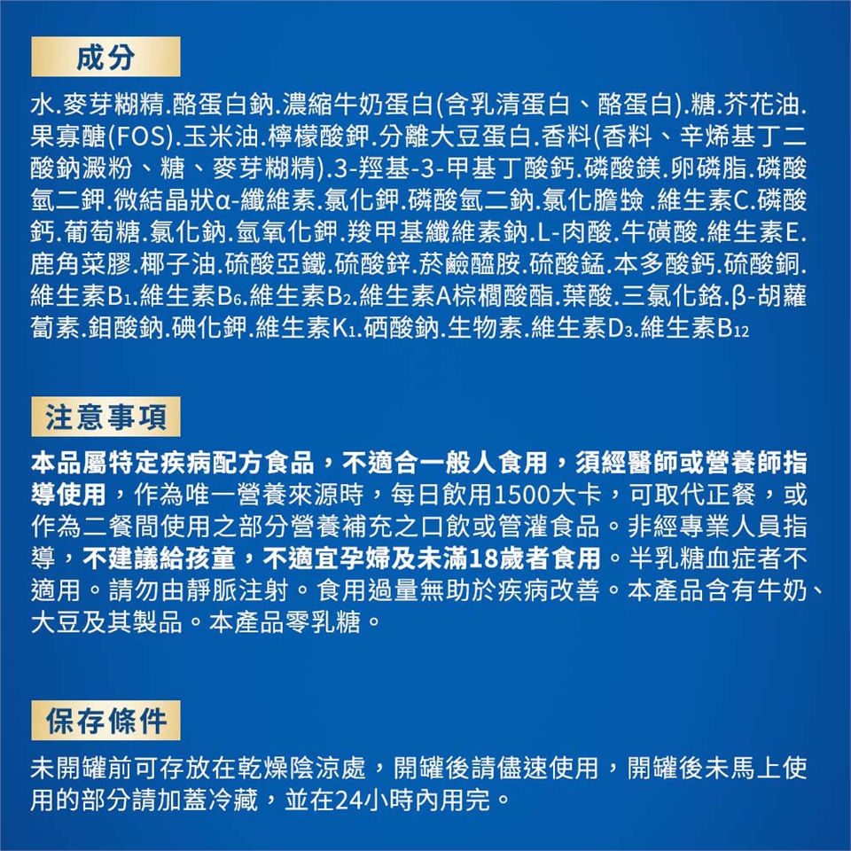 本品屬特定疾病配方食品,不適合一般人食用,須經醫師或營養師指導使用,作為唯一營養來源時,每日飲用1500大卡,可取代正餐,或作為二餐間使用之部分營養補充之口飲或管灌食品。非經專業人員指導,不建議給孩童,不適宜孕婦及未滿18歲者食用。半乳糖血症者不適用。請勿由靜脈注射。食用過量無助於疾病改善。本產品含有牛奶、大豆及其製品。本產品零乳糖。營養宣稱以100毫升為衡量基準。
