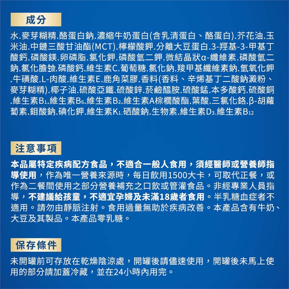 本品屬特定疾病配方食品,不適合一般人食用,須經醫師或營養師指導使用,作為唯一營養來源時,每日飲用1500大卡,可取代正餐,或作為二餐間使用之部分營養補充之口飲或管灌食品。非經專業人員指導,不建議給孩童,不適宜孕婦及未滿18歲者食用。半乳糖血症者不適用。請勿由靜脈注射。食用過量無助於疾病改善。本產品含有牛奶、大豆及其製品。本產品零乳糖。營養宣稱以100毫升為衡量基準。