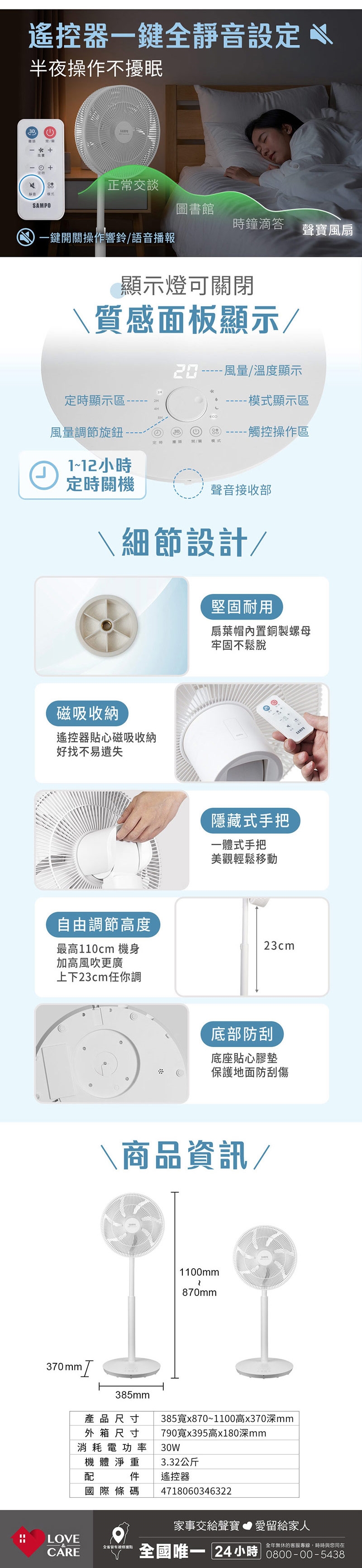 ◆遙控器一鍵全靜音設計,半夜操作不擾眠。