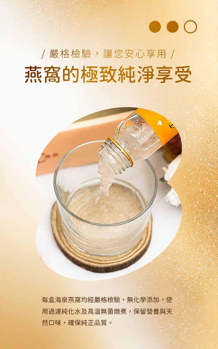 我們承諾每一盒海泉燕窩都經過嚴格的品質檢驗,無任何化學添加,讓您安心享用。