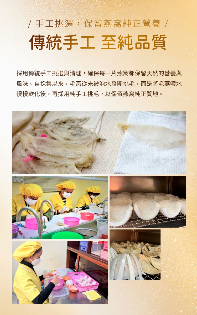 海泉燕窩採用傳統手工精心挑選與清理,確保每一片燕窩都保留營養與風味。每一口都富含優質蛋白質和多種人體必需的營養成分,為您和家人提供全方位的呵護。