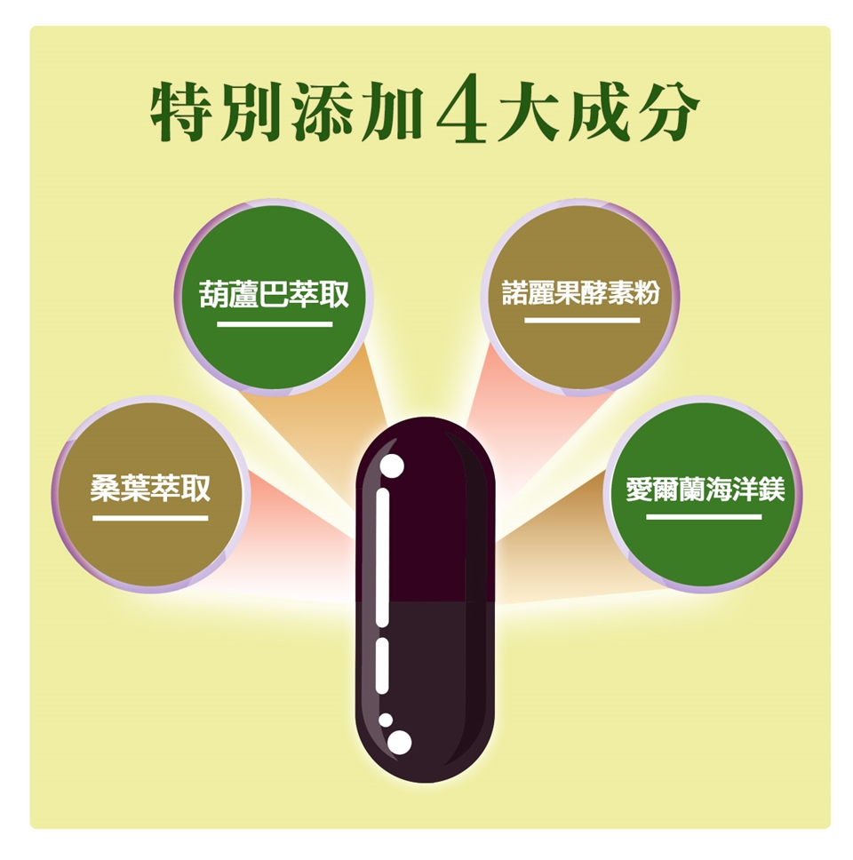 成分:專利苦瓜萃取物(含苦瓜胜肽)、諾麗果粉末、葫蘆巴萃取粉(葫蘆巴萃取、麥芽糊精)、刺五加萃取粉(刺五加萃取物、麥芽糊精)、葡萄皮萃取物(含白藜蘆醇)、鉻酵母、海洋鎂(海洋鎂、玉米澱粉)、葡萄糖酸鋅、桑葉萃取粉(桑葉萃取物、麥芽糊精)、硬脂酸鎂、黑苦瓜萃取物