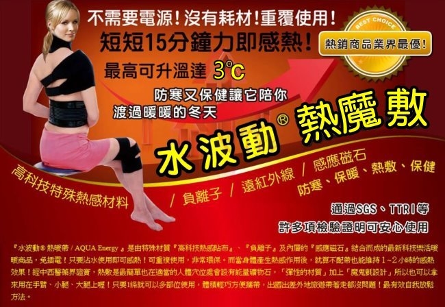 『水波動R健康神奇熱魔敷』發熱原理:藉由水分子與熱感觸煤反應,因此不需電源,也能快速感熱可重複使用數百次