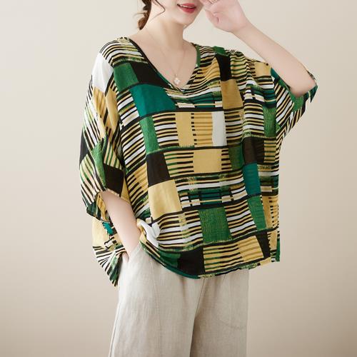 AKARA 涼感 棉麻 大碼 自然棉麻手感藤蔓五分袖上衣 3XL可(涼感 棉麻 中大尺碼)