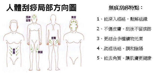 A:所謂無痕就是不會傷到表皮,癒後絕對不會留下痕跡,刮痧後雖然會有一點脹紅,但很快就會退掉,不但不傷害皮膚,還會使皮膚更有光澤更有彈性