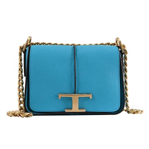 TODS T Timeless 金屬LOGO牛皮翻蓋肩斜背鍊包.亮藍