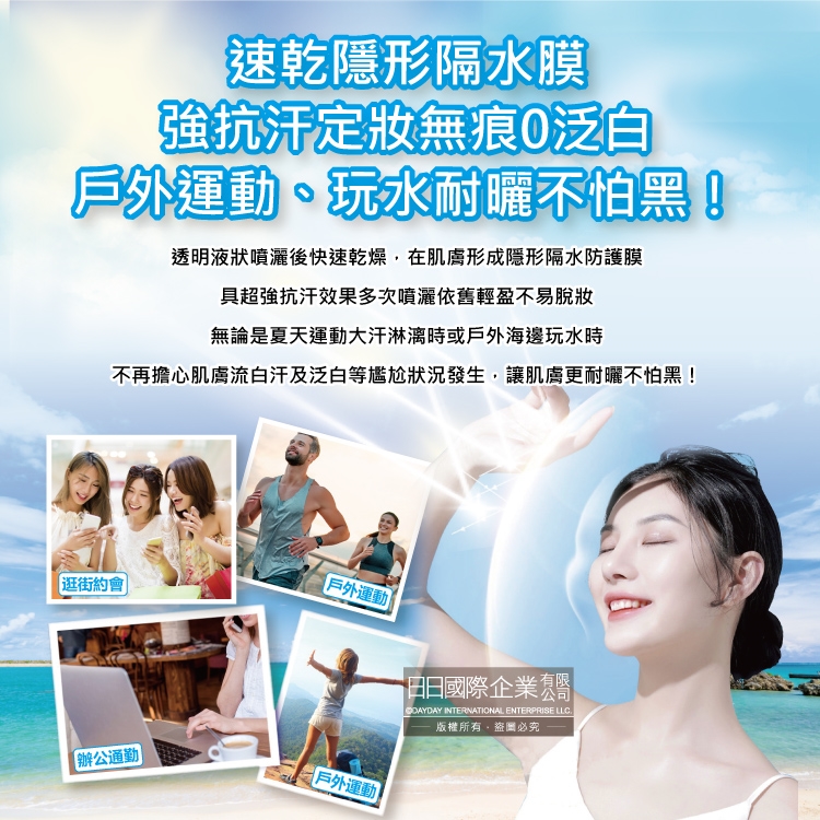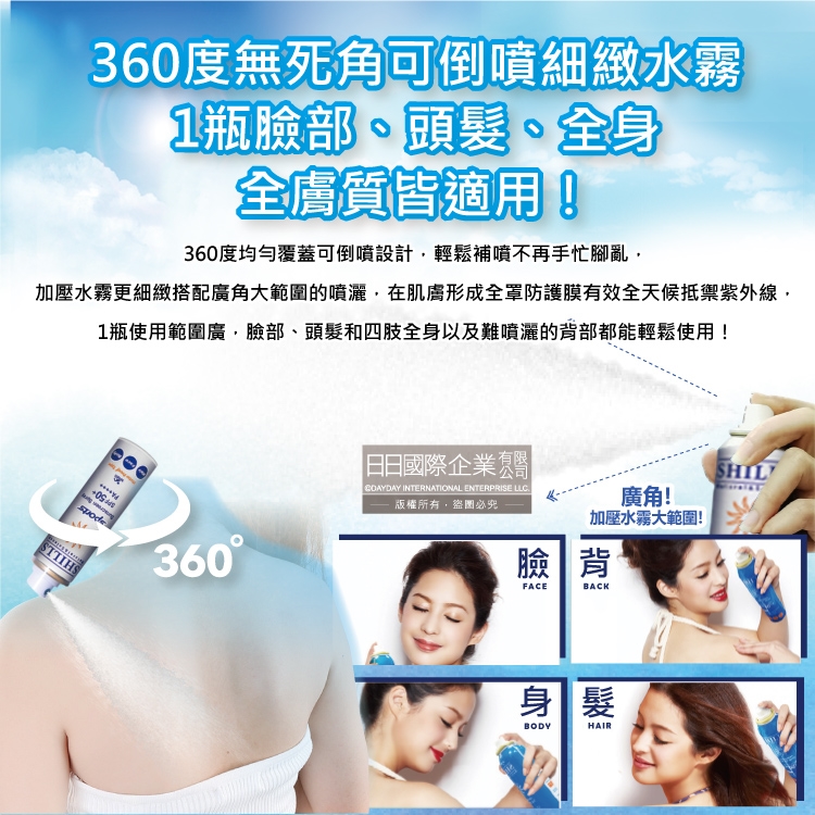 (10)為了保持防曬效果,噴塗量要足夠,並請1~2小時補噴。