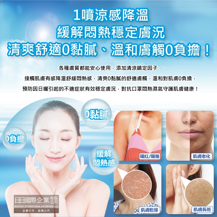 (2)使用於臉部時,請先噴於手掌中,再少量多次均勻塗抹於臉上即可。
