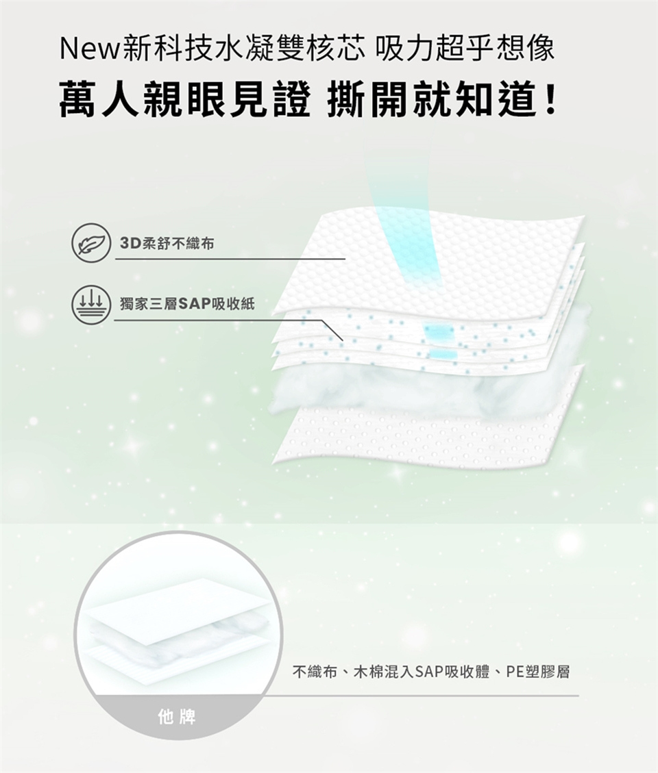 材質:純木紙漿、不織布、透氣PE塑膠層、高分子吸收體、彈力聚氨酯