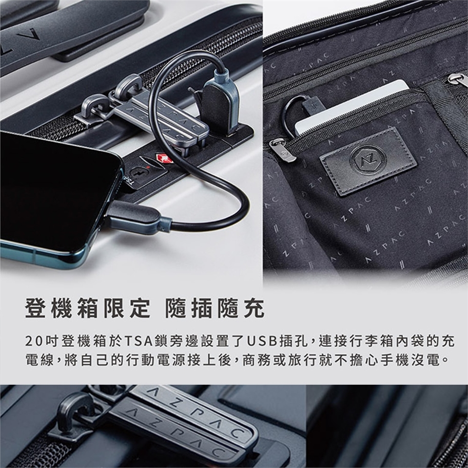 + 行李箱頂部設置了一阜USB插孔,連接行李箱內袋的充電線,並接上行動電源,為手機用電量大的旅人,帶來便利