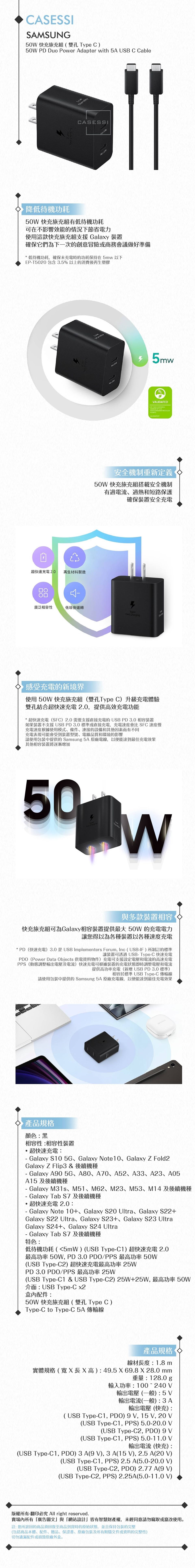 盒內配件:50W 快充旅充頭、Type-C to Type-C 5A 傳輸線(1.8m)、使用手冊