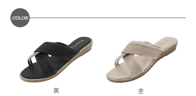 【QUEENA】氣質貼鑽緞布X造型坡跟拖鞋/閃耀氣質貼鑽緞布X造型坡跟拖鞋 女鞋 金