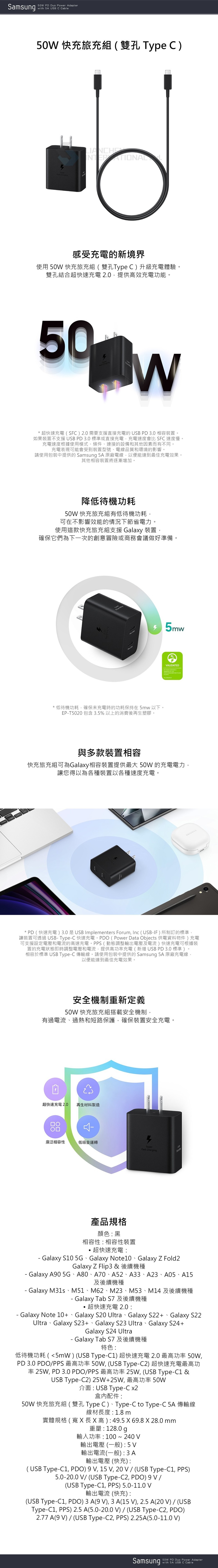 盒內配件:50W 快充旅充頭 ( 雙孔 Type C )、Type-C to Type-C 5A (1.8 m) 傳輸線、使用手冊