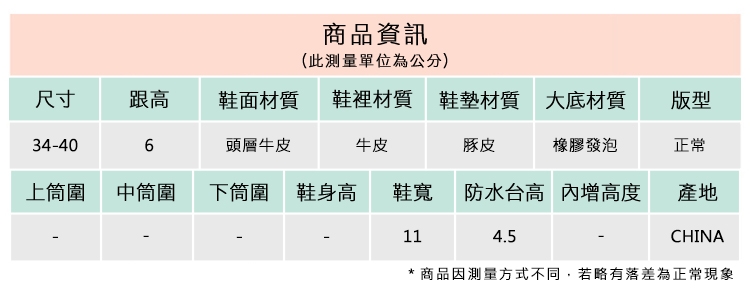 2.鞋類商品依功能及用途之不同,鞋底各有其止滑係數之個別不同,使用鞋類商品請用於正常平坦之路面,非雨鞋或雨靴類商品,請避免穿著於下雨濕滑路面上行走。