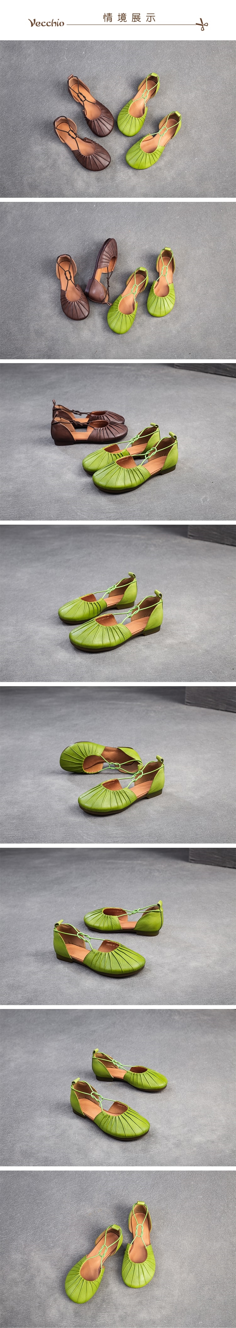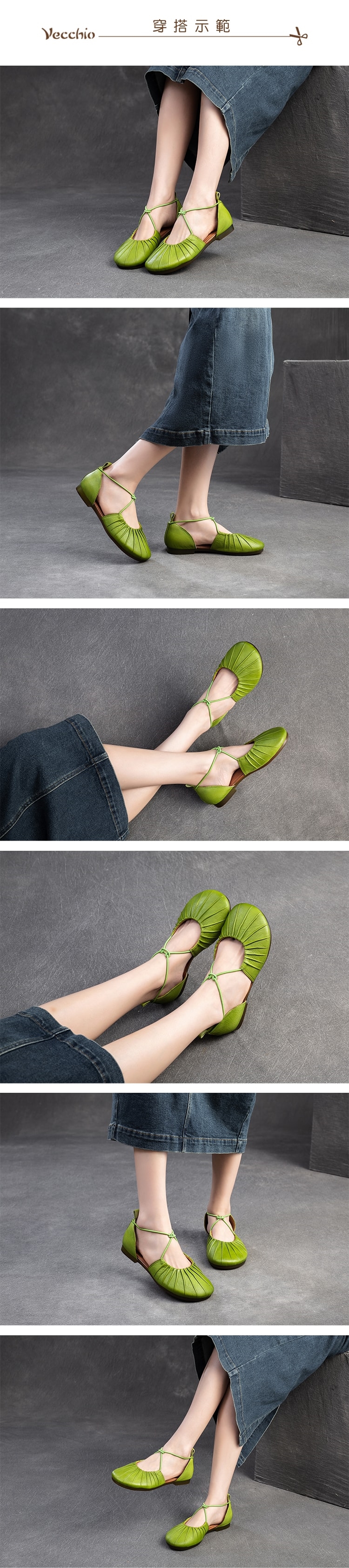 【VECCHIO】全真皮抓褶交叉低跟包頭涼鞋/全真皮頭層牛皮復古抓褶交叉帶小圓頭低跟包頭涼鞋 女鞋 綠