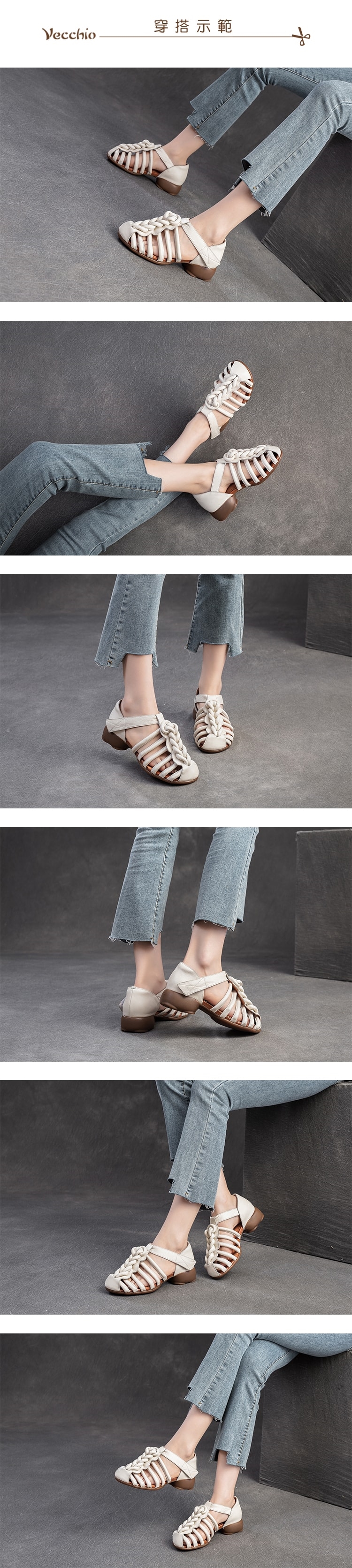 【VECCHIO】全真皮編織包頭粗跟羅馬涼鞋/全真皮頭層牛皮復古手工編織包頭粗跟羅馬涼鞋 女鞋 米