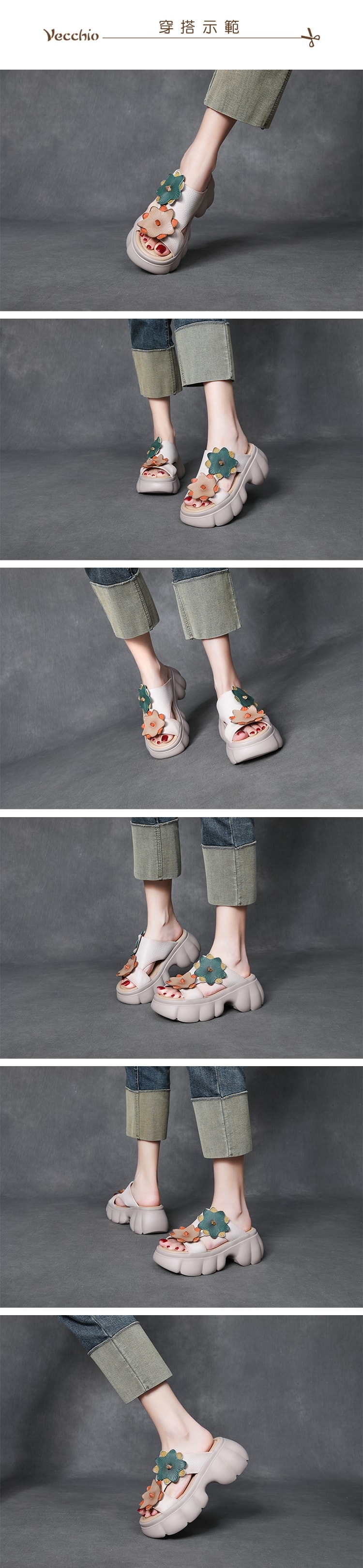 【VECCHIO】真皮彩色皮雕花朵厚底拖鞋/真皮頭層牛皮復古彩色皮雕花朵厚底拖鞋 女鞋 米