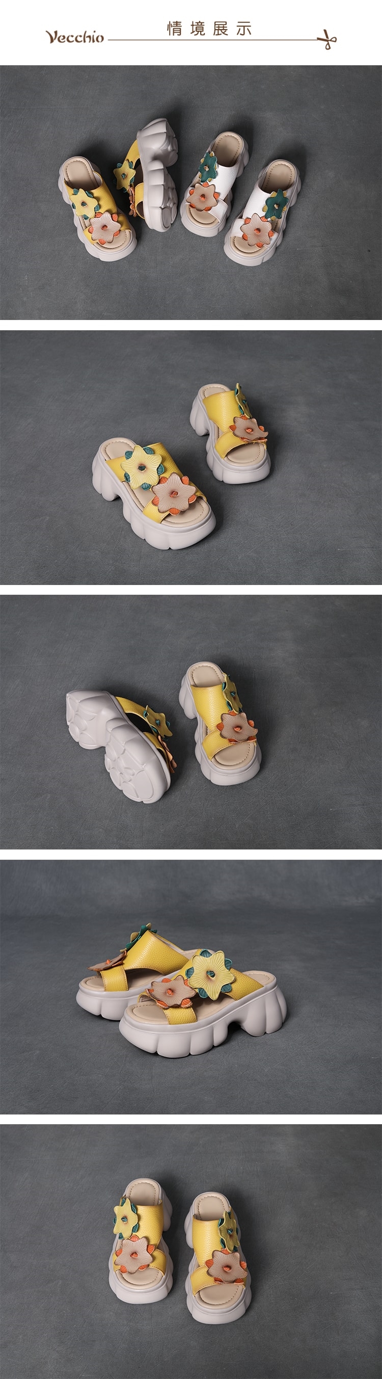 【VECCHIO】真皮彩色皮雕花朵厚底拖鞋/真皮頭層牛皮復古彩色皮雕花朵厚底拖鞋 女鞋 黃