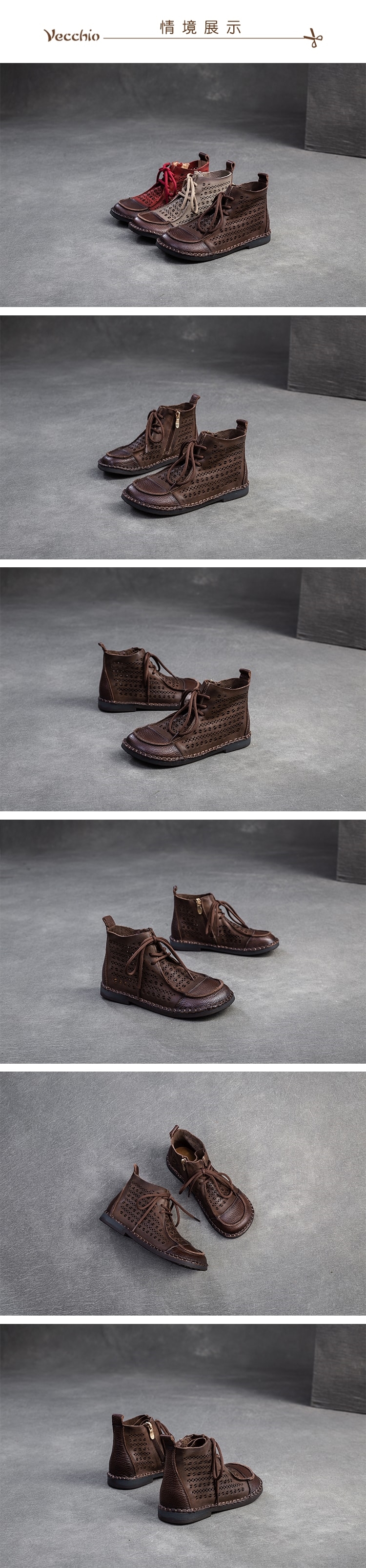 【VECCHIO】全真皮縷空拼接繫帶短靴/全真皮頭層牛皮復古縷空民族風拼接繫帶短靴 女鞋 棕