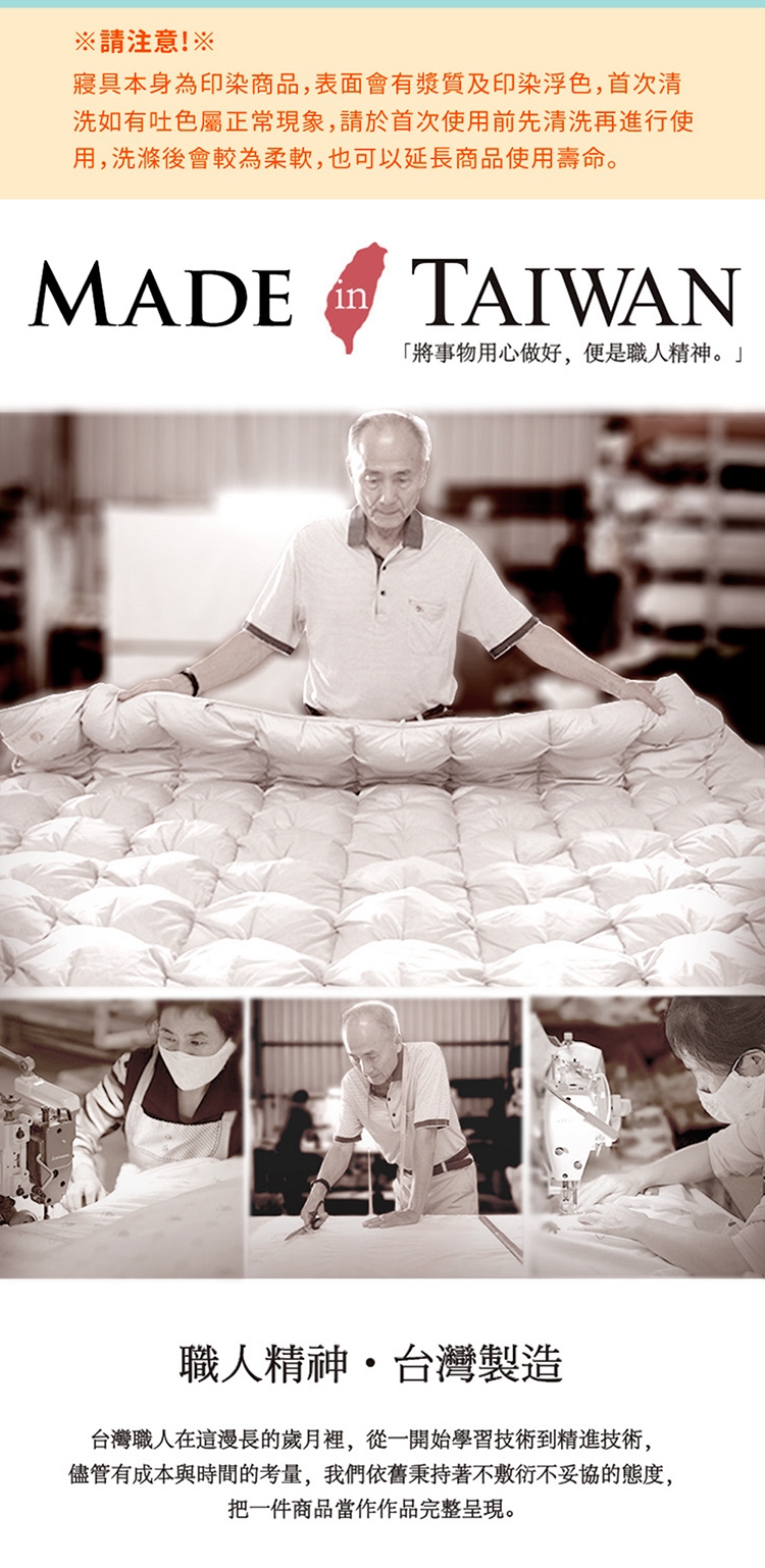 ※寢具本身為印染商品,表面會有漿質及印染浮色,首次清洗如有吐色屬正常現象,請於首次使用前先清洗再進行使用,洗滌後會較為柔軟,也可以延長商品使用壽命。