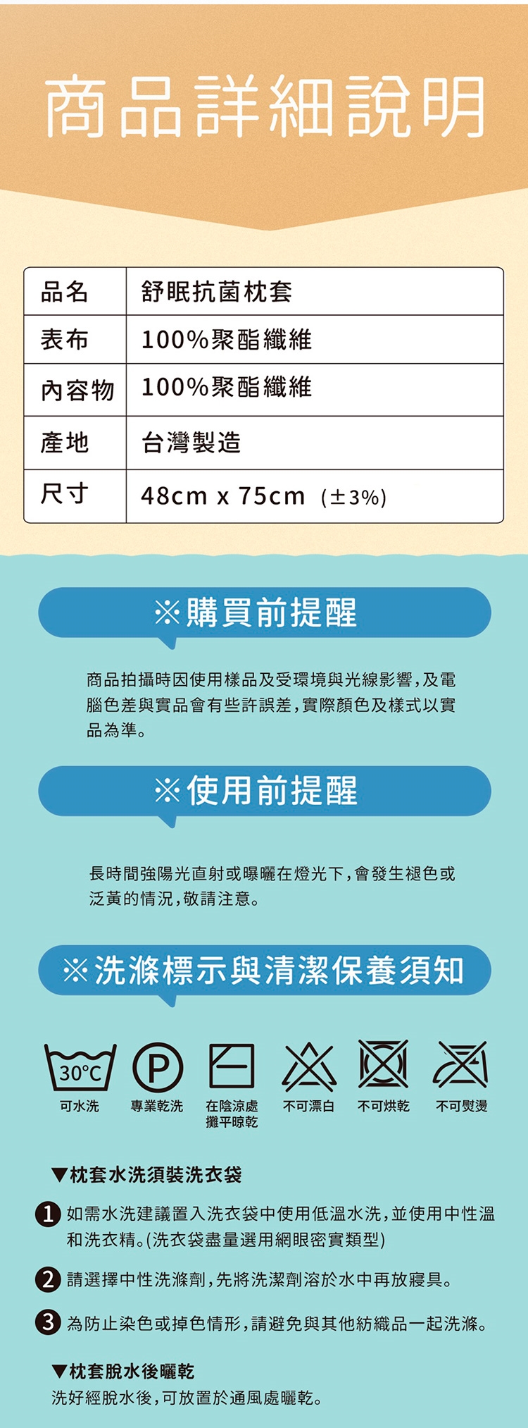 ※枕套僅限手洗,務必於陰涼處攤平晾乾後再做使用。