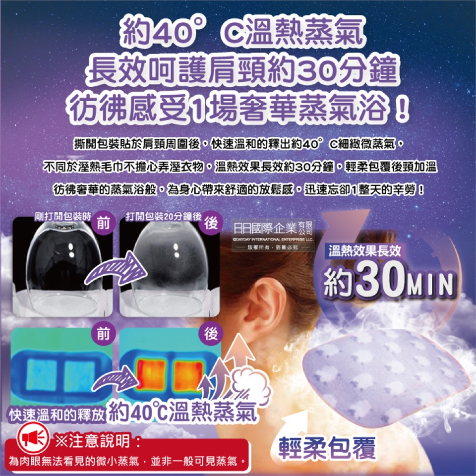 ●品名:約40°C蒸氣睡前溫感肩頸熱敷貼片