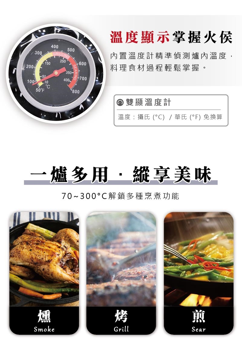 ✔ 兼具燒烤、烘烤、燉煮、煙燻等多種烹飪方式。