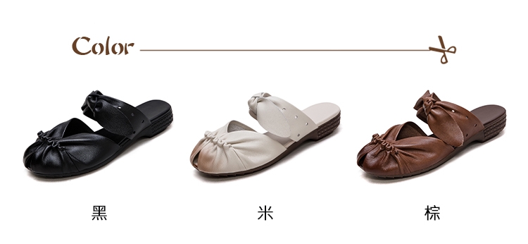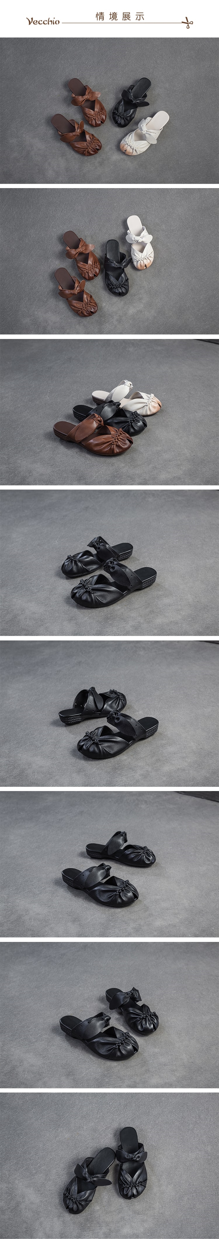 【VECCHIO】真皮皺褶花邊蝴蝶結低跟包頭拖鞋/真皮頭層牛皮皺褶花邊蝴蝶結一字帶設計低跟包頭拖鞋 女鞋 黑